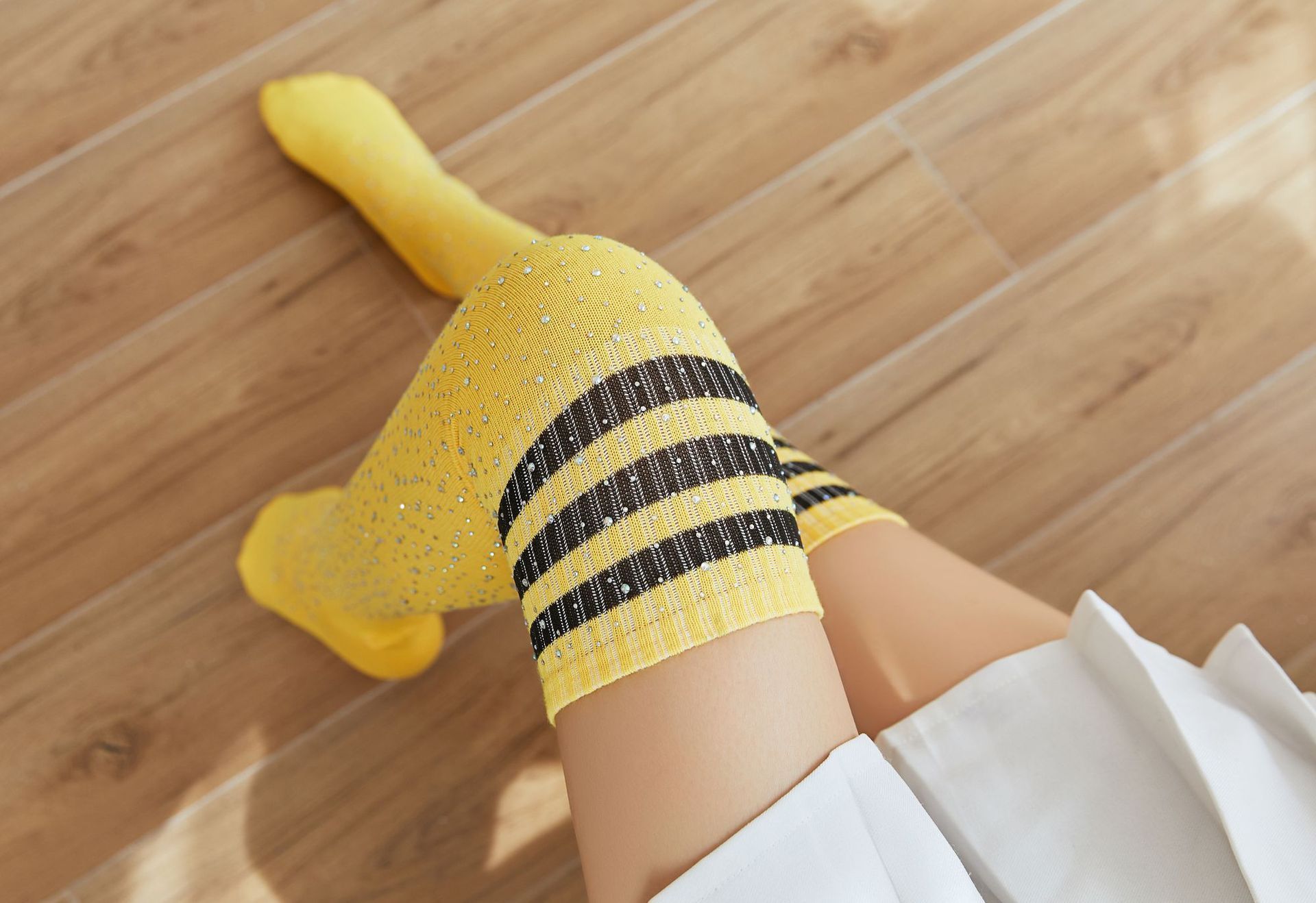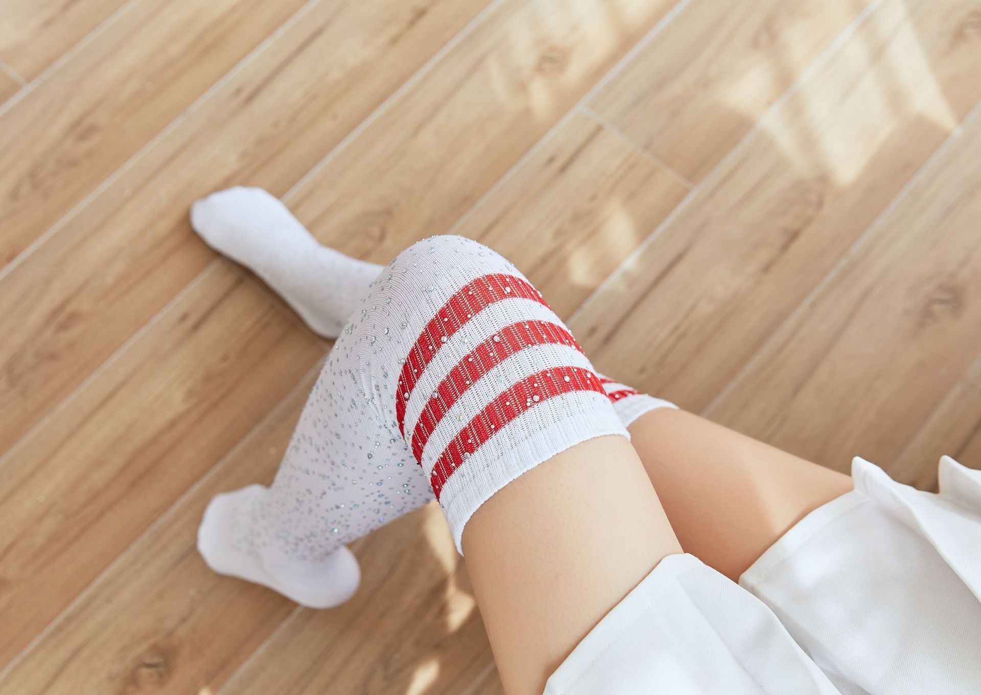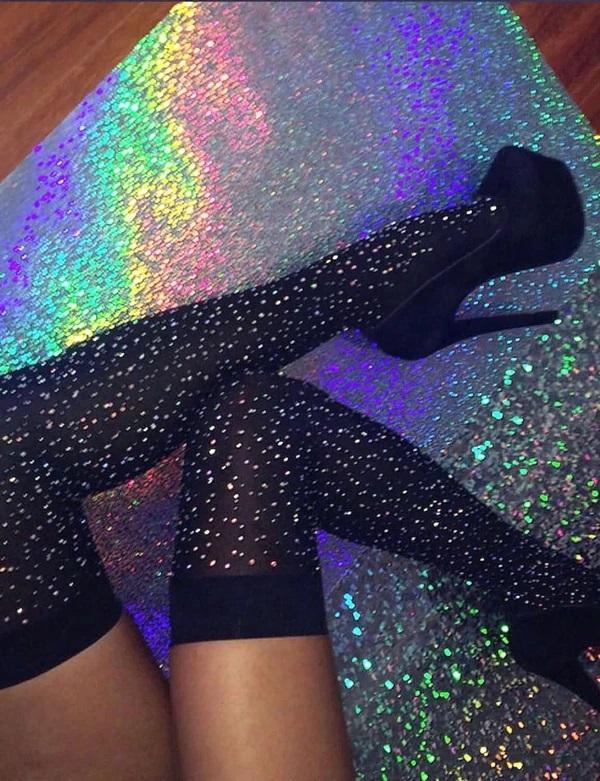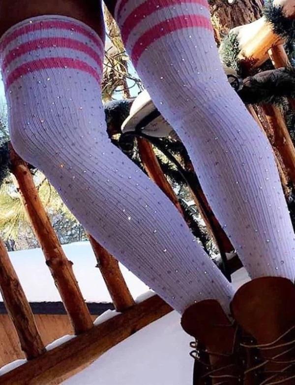Glittering Rainbow Rhinestone Striped Over Knee Socks Blue Stripes